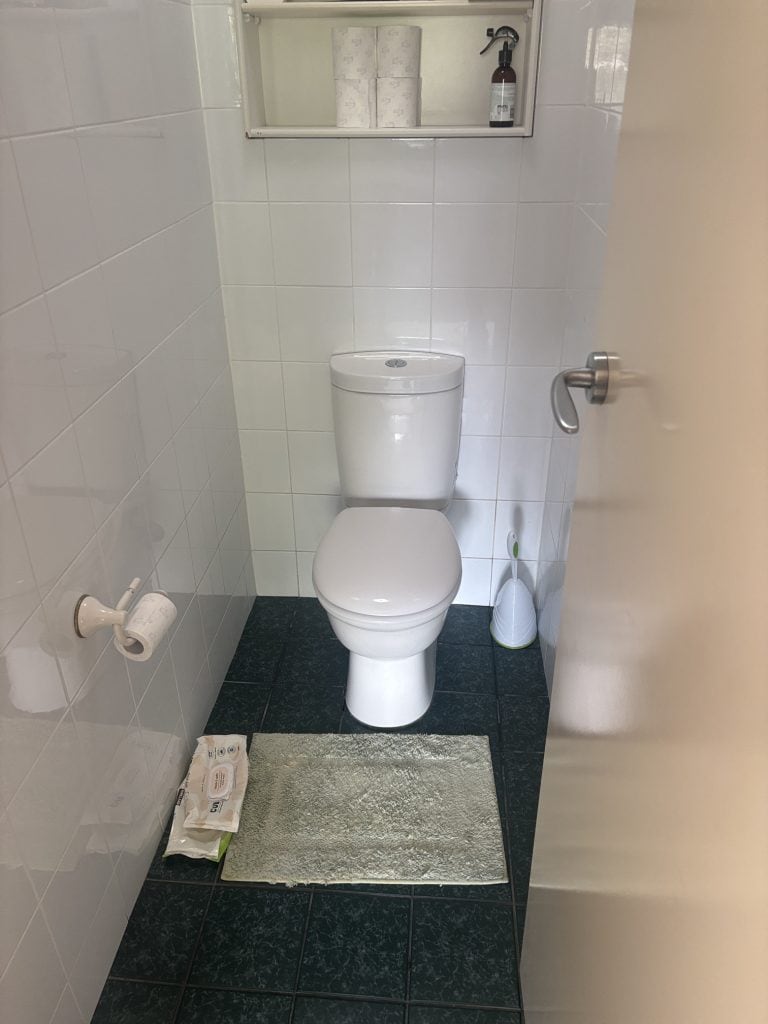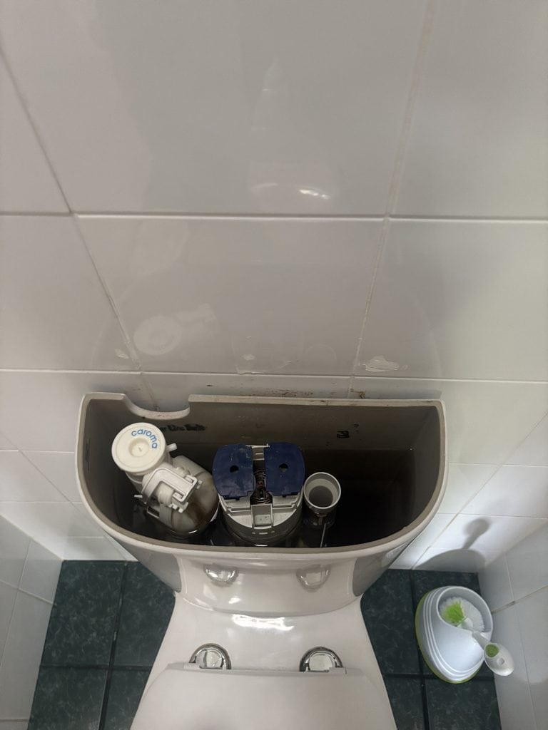 After isolating and testing all plumbing lines, Andre confirmed that no pressure loss was occurring, a clear indicator that the leak wasn’t from a pressurised water source. He then inspected the upstairs bathroom above the kitchen and found significant dampness around the main toilet base. The likely culprit: a failed pan collar seal or drainage issue beneath the toilet.
