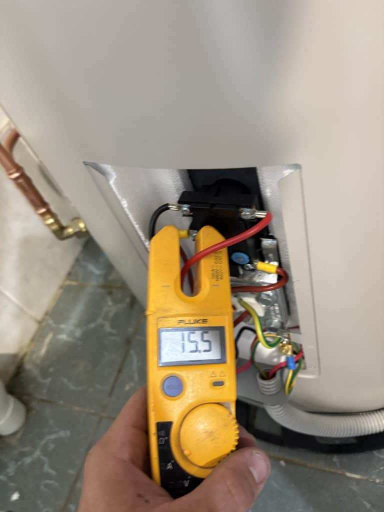 All connections were made using WaterMark-certified copper fittings, tested for leaks, and commissioned to manufacturer specifications. Brayden verified electrical performance, confirming stable power draw and safe thermostat function using a Fluke multimeter (reading 15.5A under load).