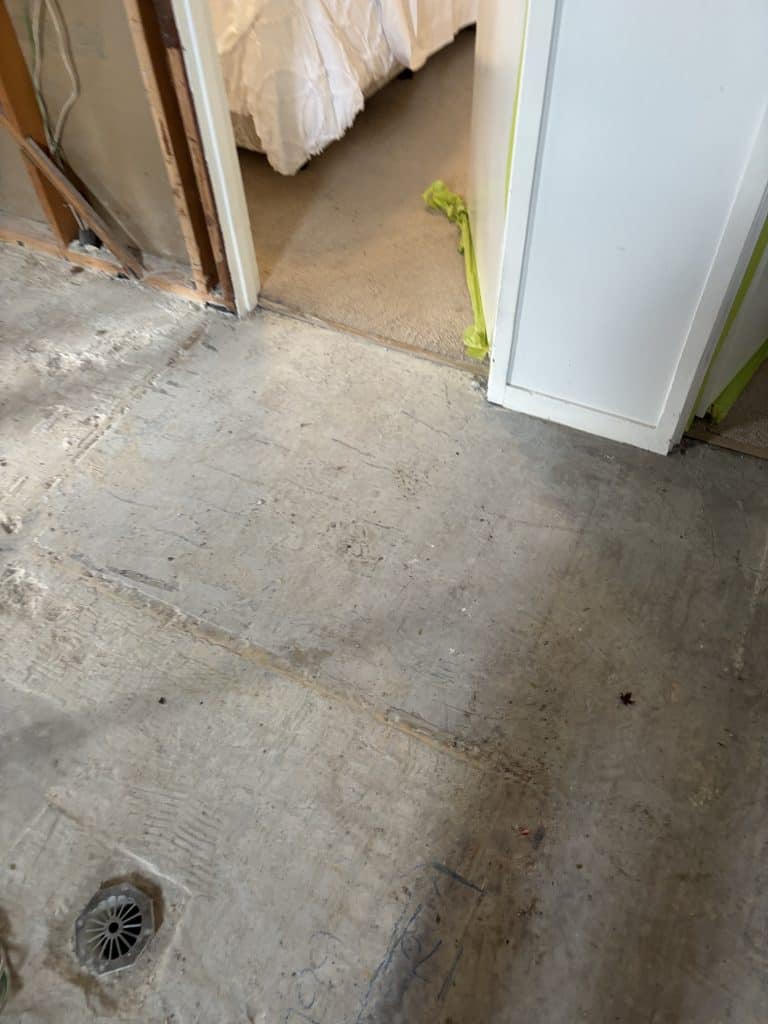 - With the bathroom stripped to the slab, Tom assessed whether previous fixtures or waterproofing could have contributed