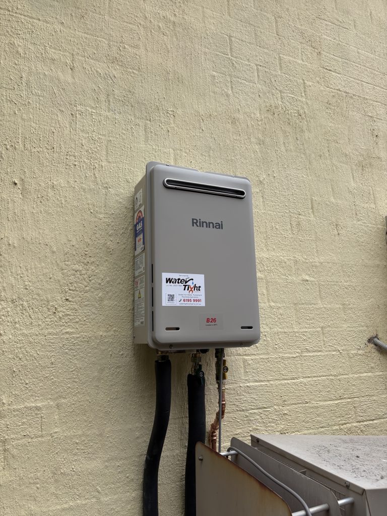Installed a Rinnai Builders B26 gas continuous flow hot water system, set at 50°C for safe household use.